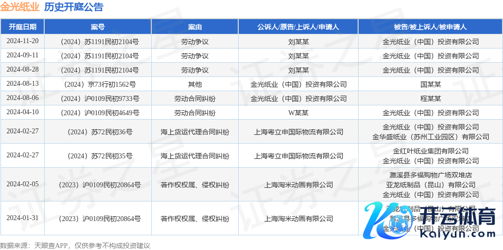 案号:(2024)苏1191民初2104号审理法院:镇江经济成立区东说念主民法院案由:劳动争议当事东说念主信息: 原告/上诉东说念主:刘某某 被告/被上诉东说念主:金光纸业(中国)投资有限公司开庭日历:2024年11月20日左证统计,近一年内以金光纸业(中国)投资有限公司为当事东说念主的历史开庭公告有10则,其中案由为“劳动争议”的公告以3则居首,其次为“劳动公约纠纷”有2则,“海上货运代理公约纠纷”有2则。历史开庭公告如下: