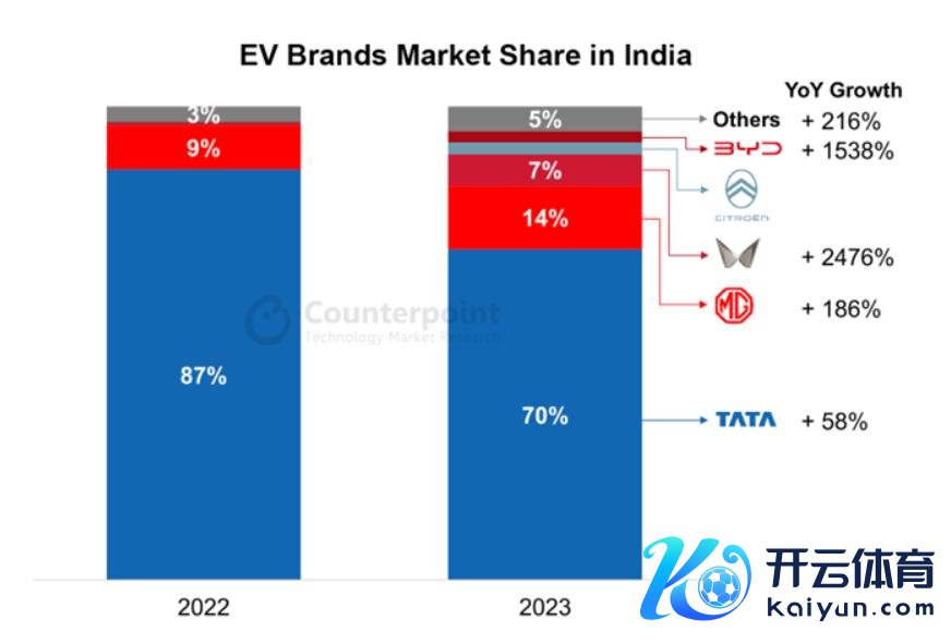 紧随塔塔汽车之后的是MG品牌,以14%的市占率排在印度市集第二。MG品牌凭借其前锋的外不雅谋略、先进的科技竖立以及懒散的驾乘体验,在印度电动汽车市集合赢得了不少消耗者的疼爱。固然比亚迪在印度电动汽车市集的名次仅为第五,但其增长速率却是最为惊东说念主的。比亚迪凭借其在公共新能源汽车领域的发轫地位和丰富的本领蕴蓄,在印度市集获取好评,迟缓被当地消耗者接收。