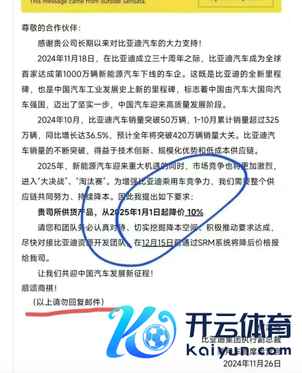 邮件内容知道,在比亚迪汽车成为众人首家达成第1000万辆新动力汽车下线的车企之际,比亚迪条目相干供应商所供货居品从2025年1月1日起降价10%。