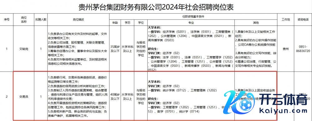 南边财经12月16日电Ninegame九游体育,贵州茅台集团官网发布贵州茅台集团财务有限公司2024年引进专科东谈主才公告,贵州茅台集团财务有限公司计划引进专科东谈主才2东谈主Ninegame九游体育,其中之一是债券来去员。公告裸露,该岗亭须具备5年及以上固定收益业务责任经历,同期握有银行间商场来去员经历证。主要细腻银行间、来去所种种债券投资、债券价钱监测等泛泛来去责任。