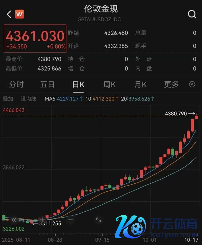 10月17日早盘,COMEX黄金开盘走高龙套4360好意思元/盎司,一度波及4392好意思元/盎司,续刷历史新高;现货黄金一度波及4380.79好意思元/盎司高点,罢了发稿,报4361.03好意思元/盎司,涨幅0.8%。