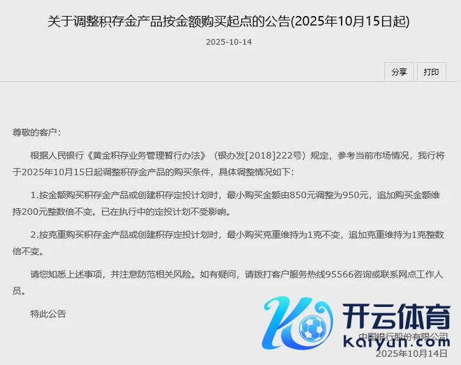 中国银行晓喻从15日起,购买积聚金家具(一种黄金投资的储蓄家具)或创建积聚定投权术时,最小购买金额由850元调整为950元。